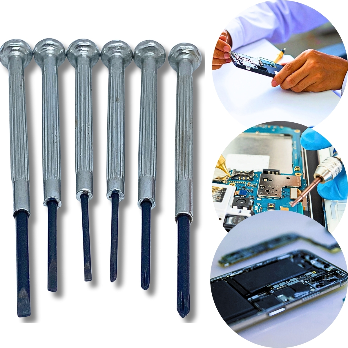 O kit contém 6 chaves de precisão, sendo 3 com ponta fenda e 3 com ponta Phillips, oferecendo versatilidade para diferentes tipos de parafusos. Fabricadas com haste metálica de alta resistência e cabos ergonômicos, garantem conforto, firmeza e controle durante o uso.