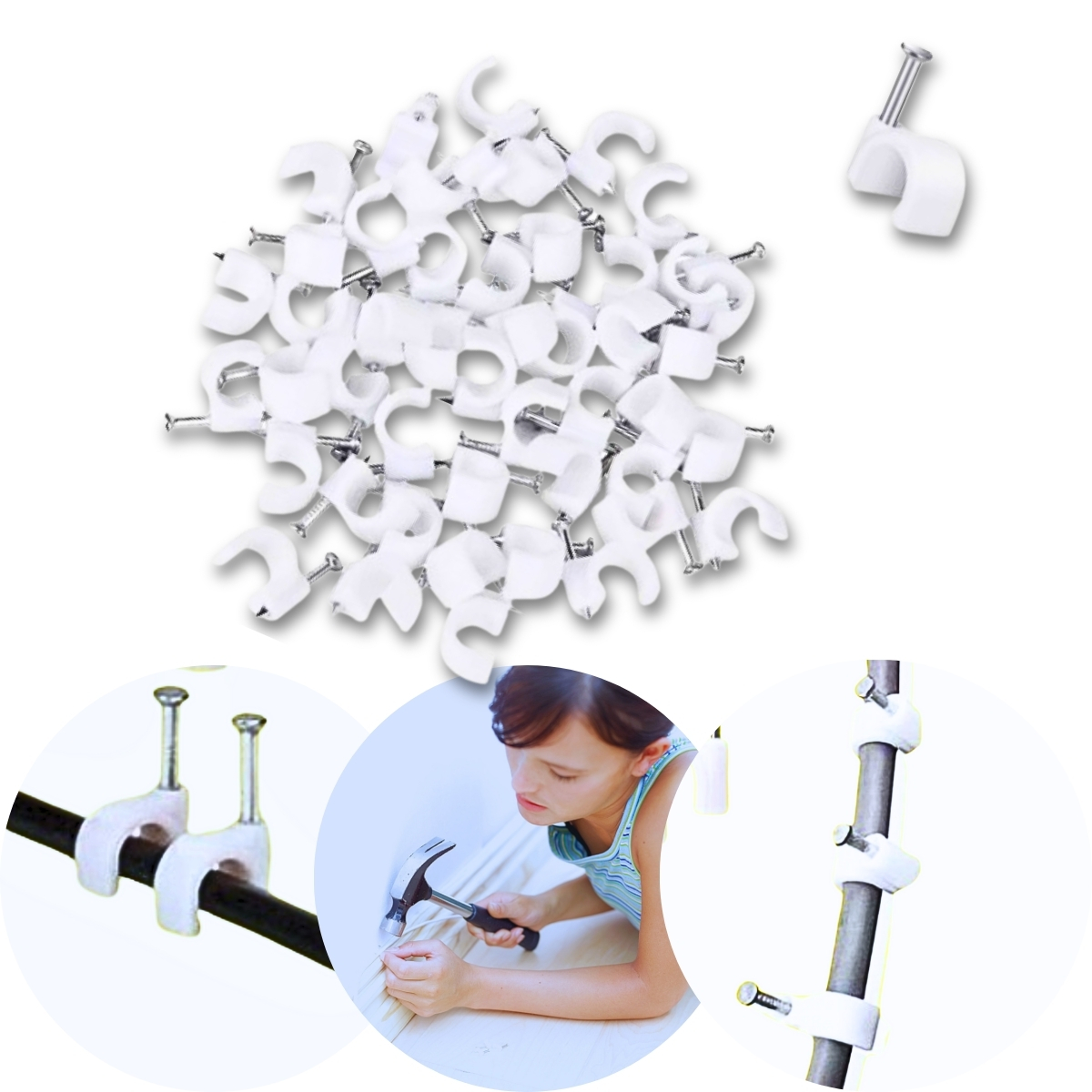 A cartela FBG-3258 vem com 50 grampos de fio curvado de 6mm, fabricados em aço resistente. Ideais para fixação de fios e cabos em paredes, rodapés ou estruturas diversas, proporcionam organização, segurança e acabamento profissional em instalações elétricas e de redes.